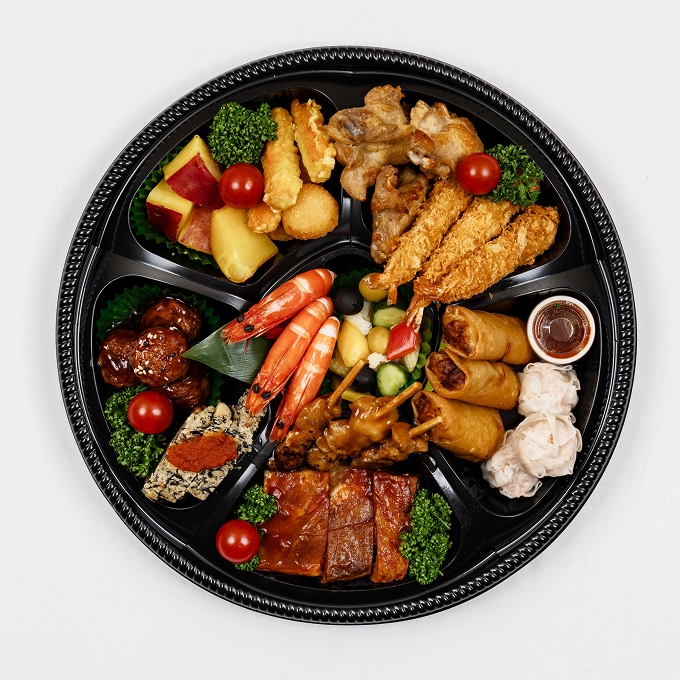 ●スペアリブ(BBQ) ●焼鳥 ●ひじきと枝豆のミートローフ ●カニシュウマイ ●春巻 ●エビフライ ●カニカマ天プラ ●ポテトフライ ●肉団子 ●あぶり焼きチキン ●ボイルエビ ●野菜マリネ ●サツマ芋甘露煮